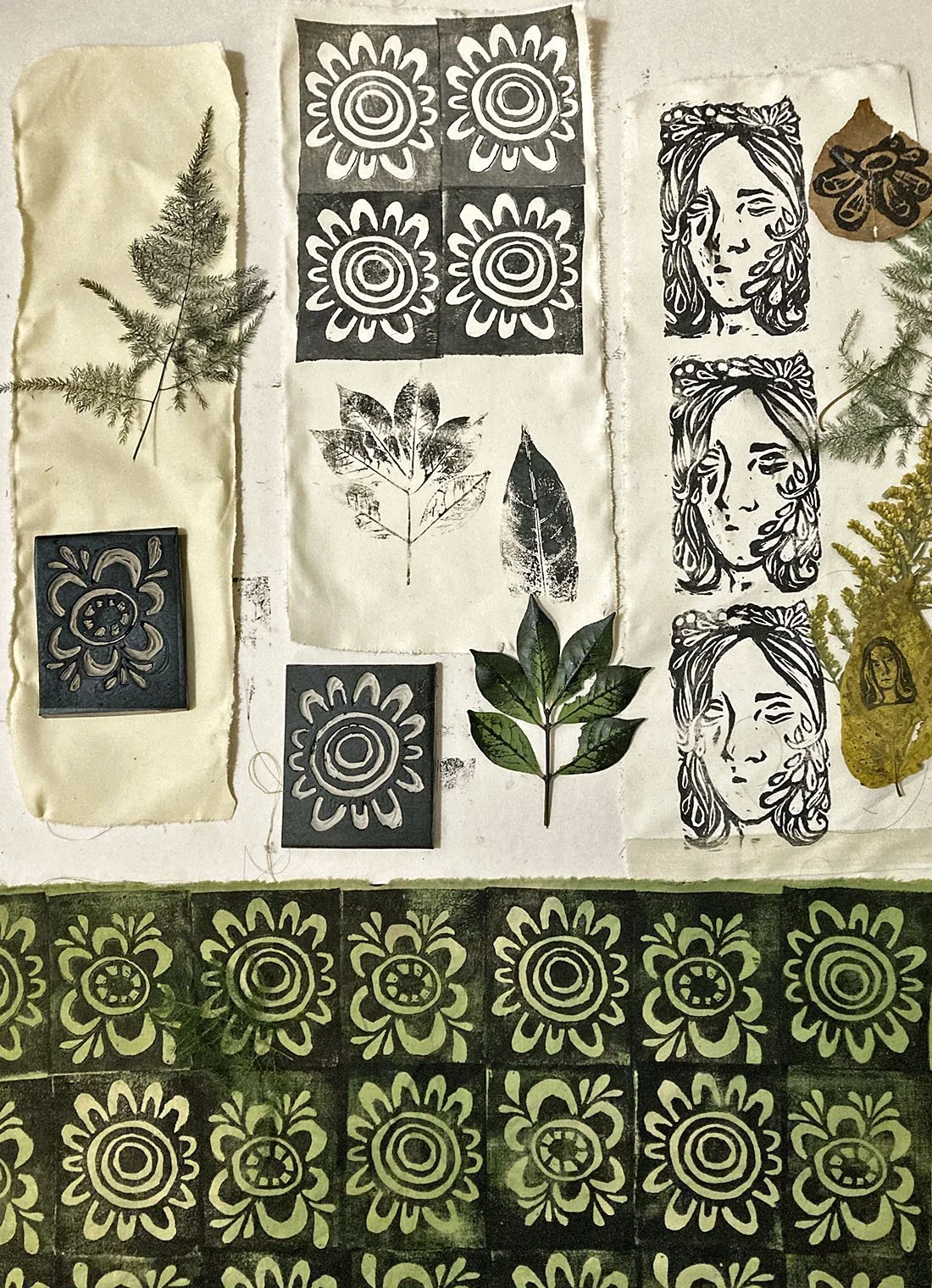 Focal Points: technique of block printing, how to make a repeating pattern and printing patterns onto a variety of fabric with different color.