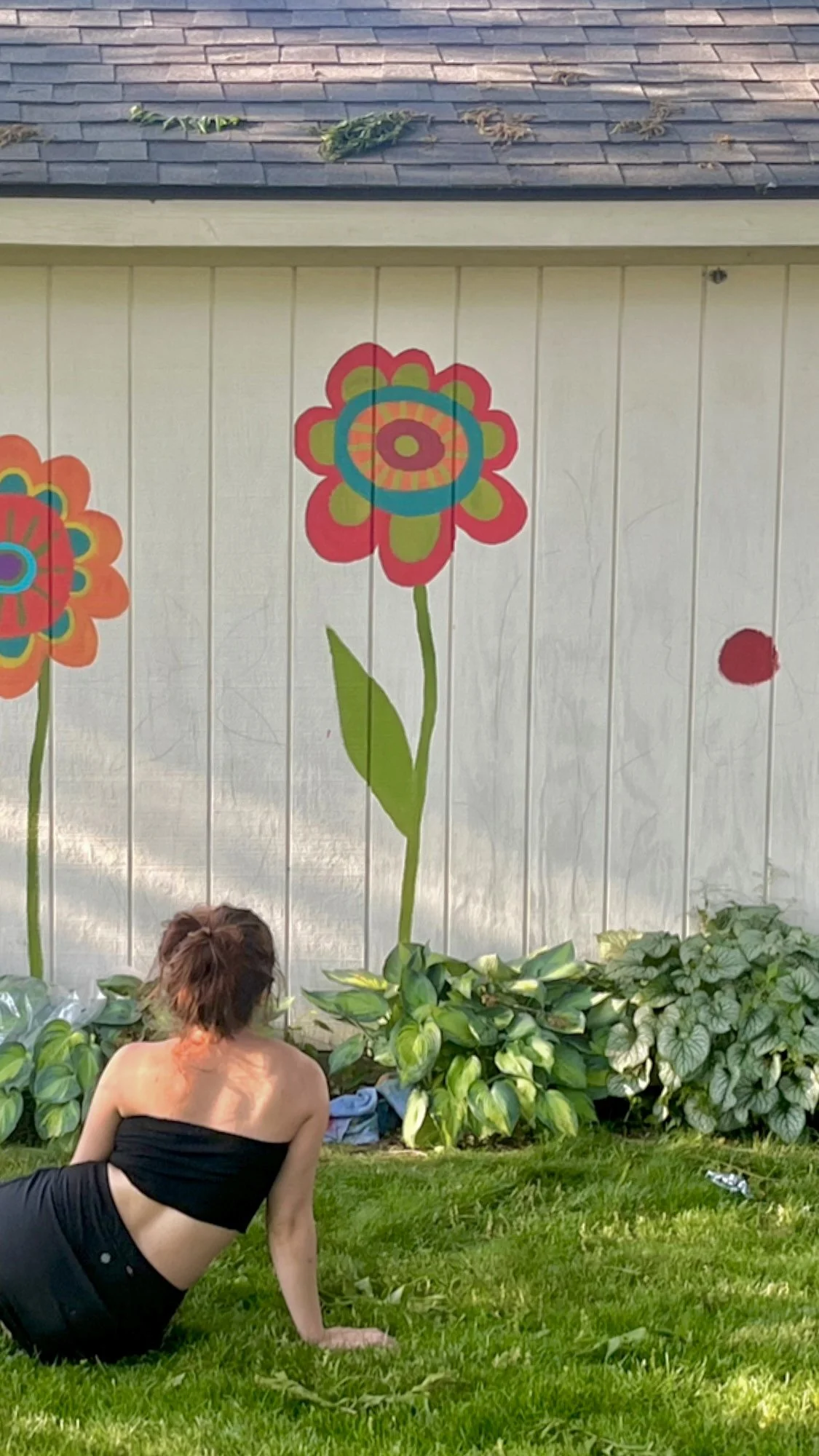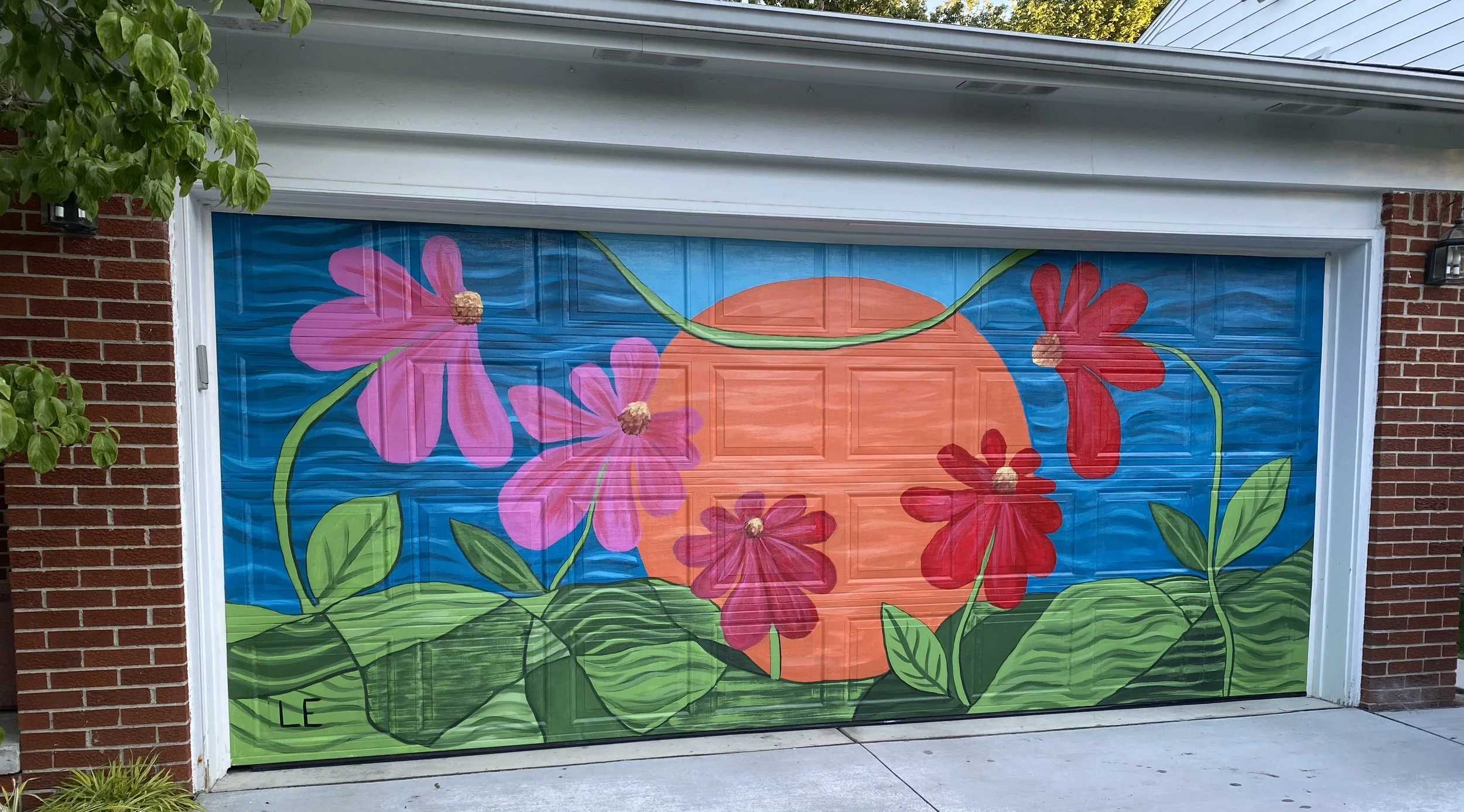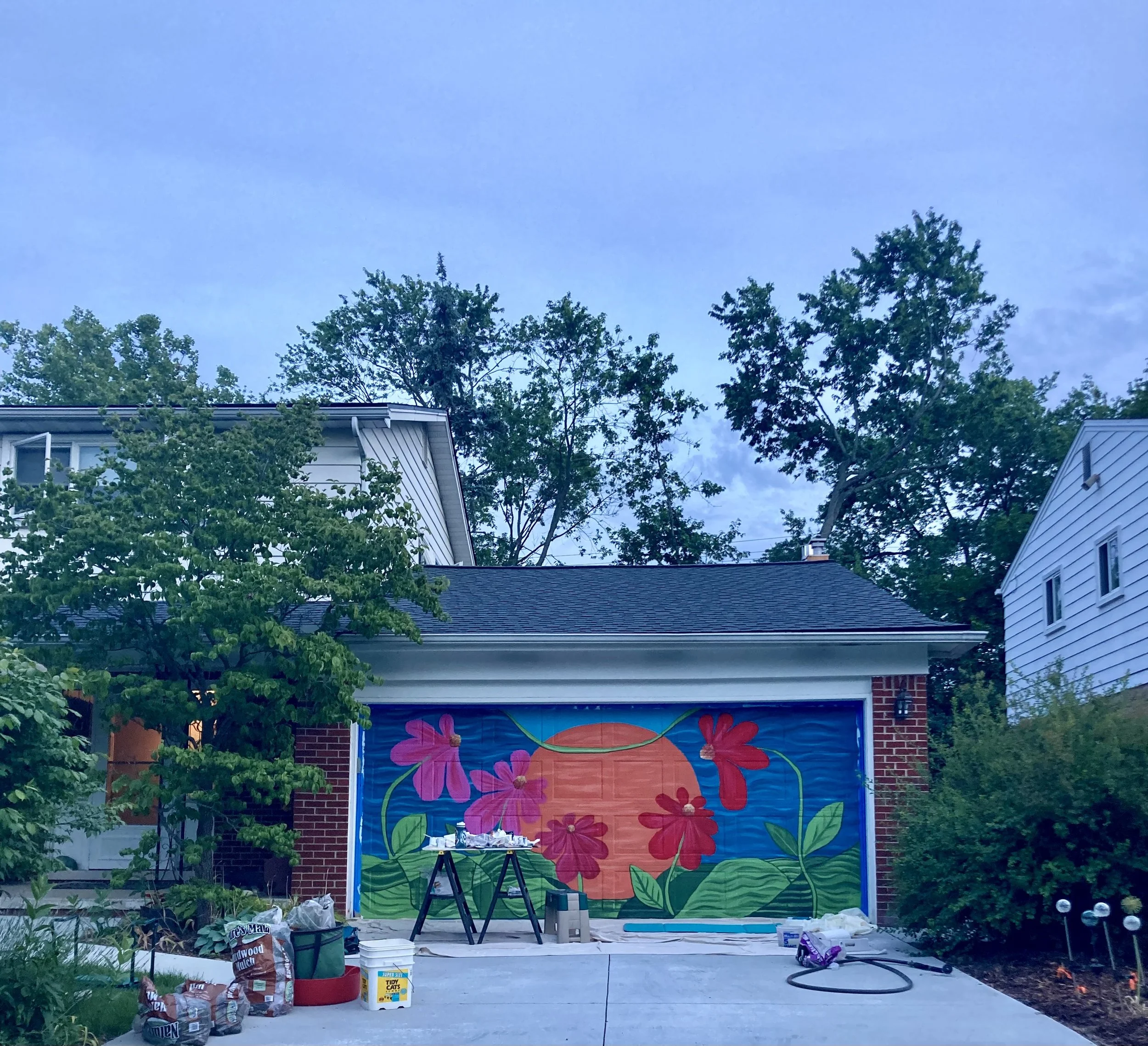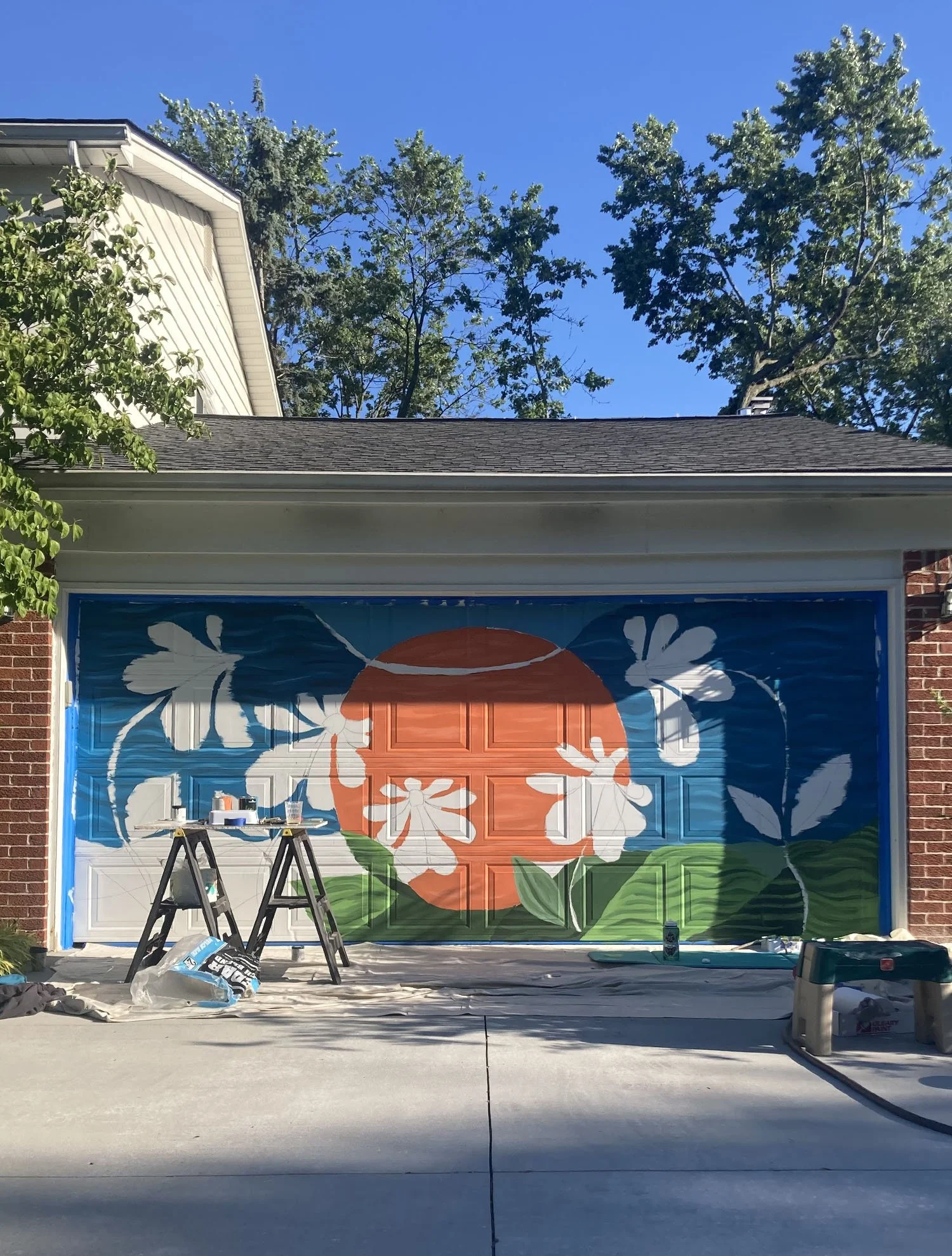 Garage Mural: Clients wanted a mural on their garage that represented a landscape of florals. Clients asked for large graphic florals inspired by shibori dye techniques.