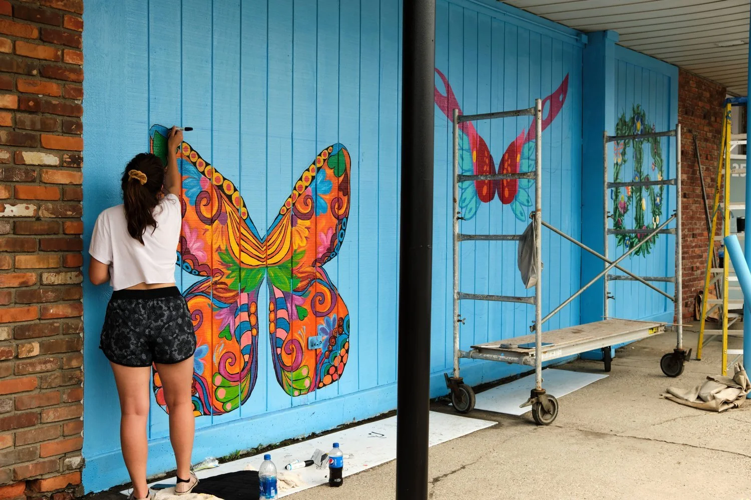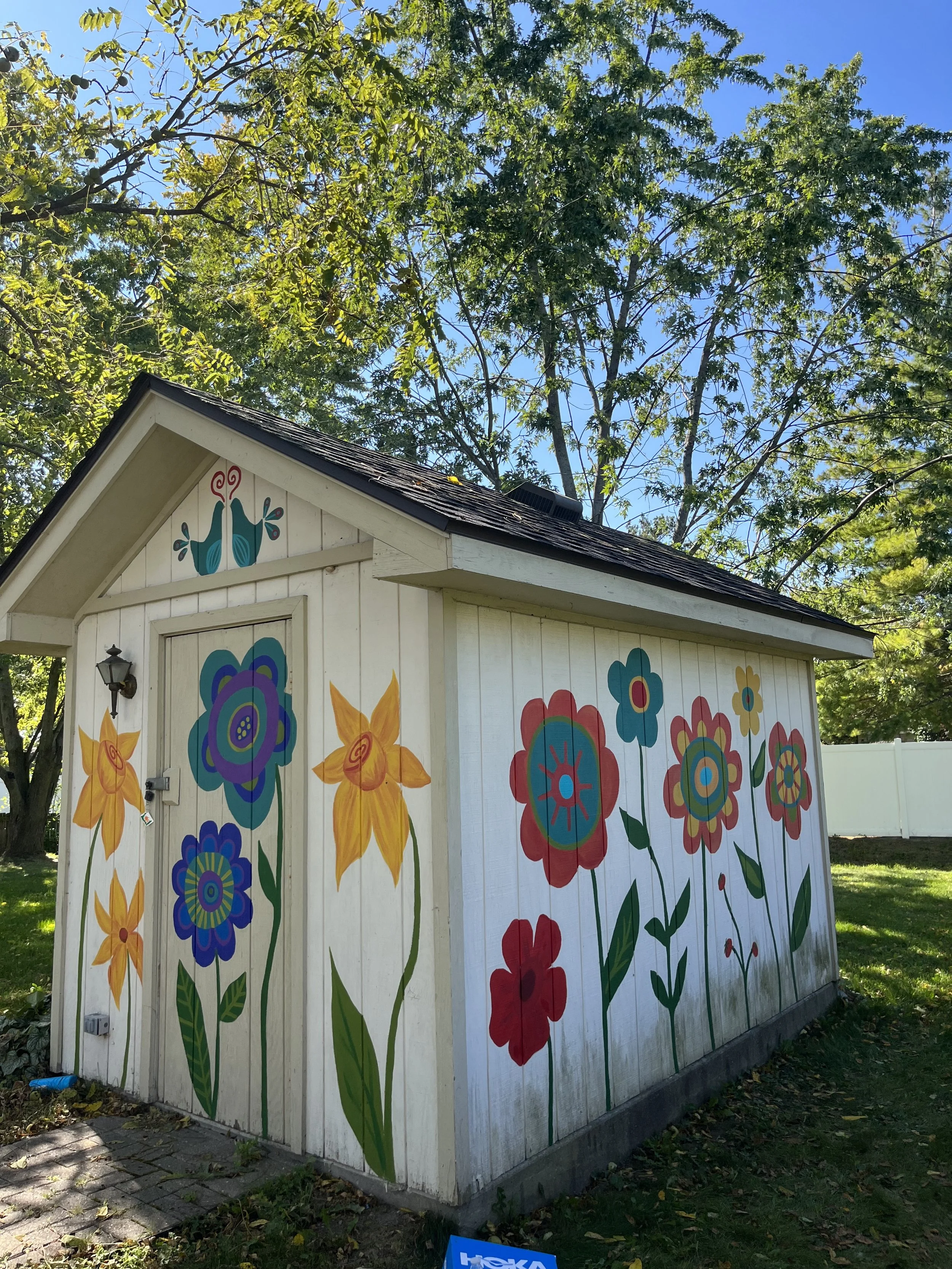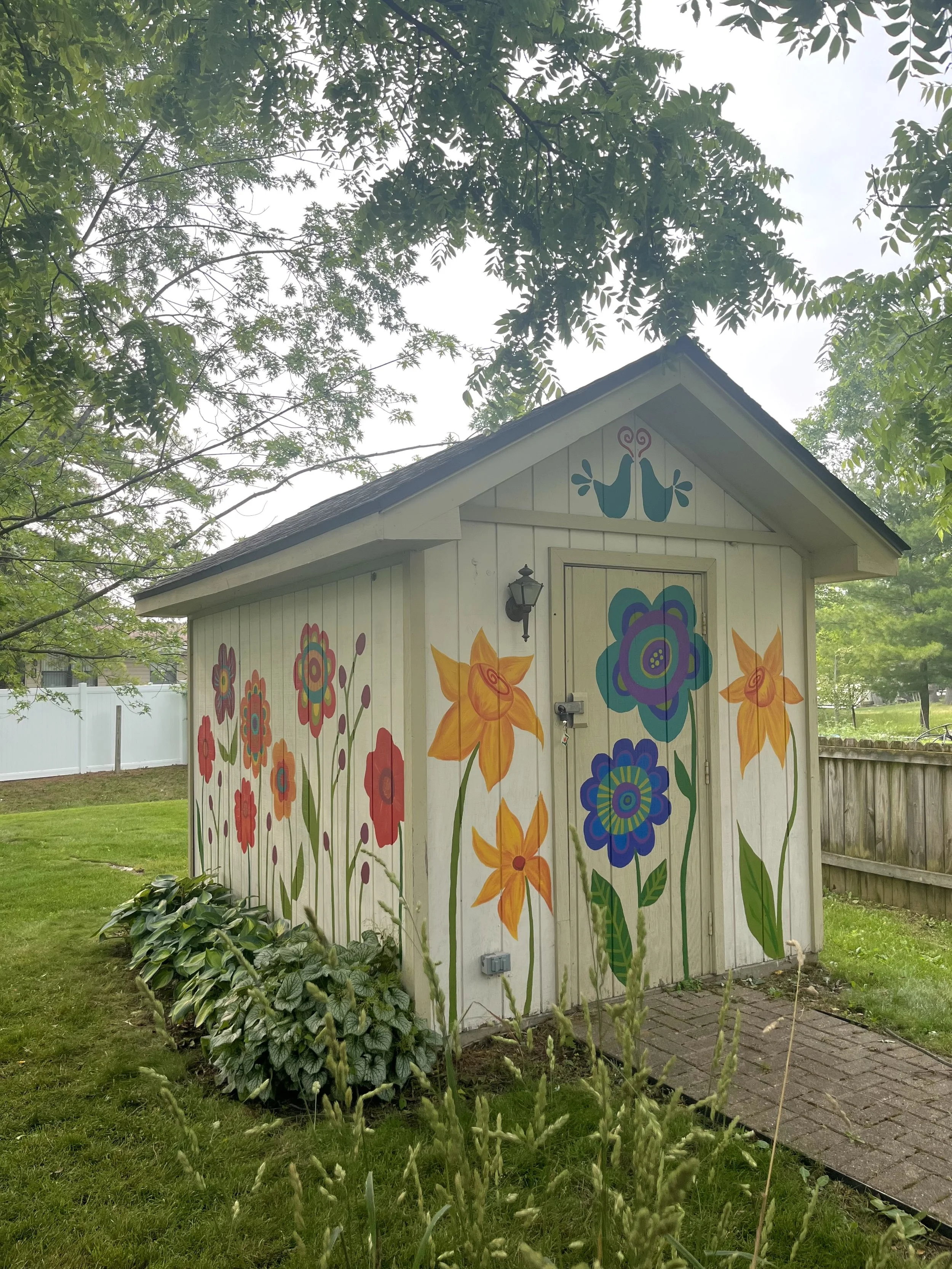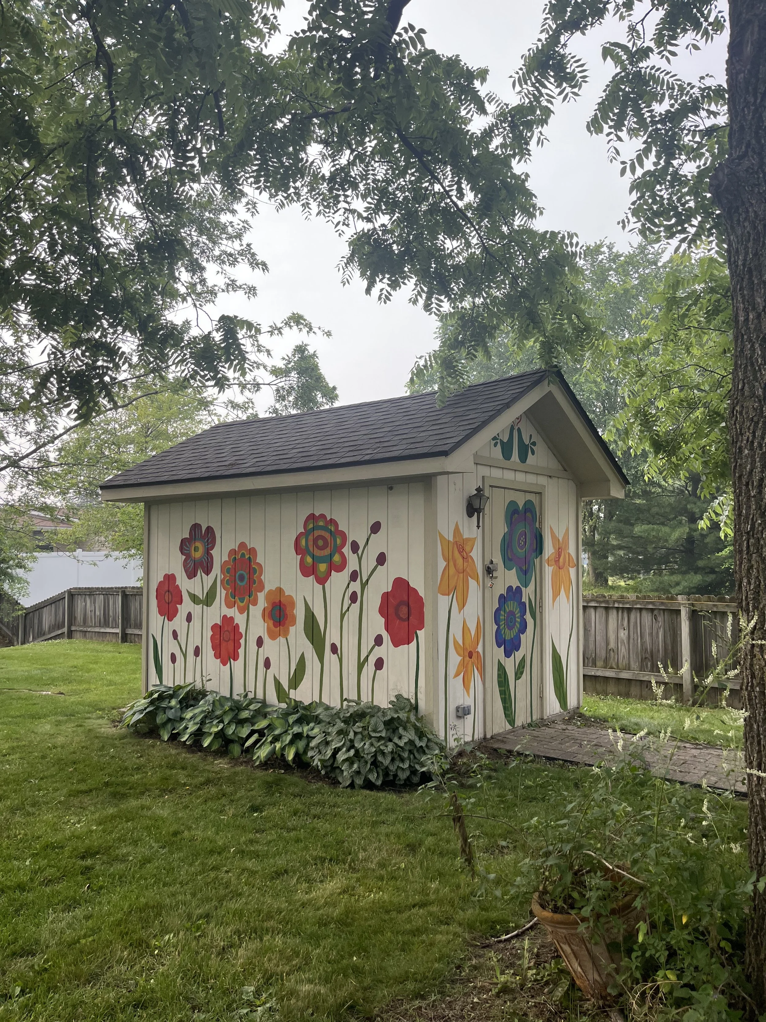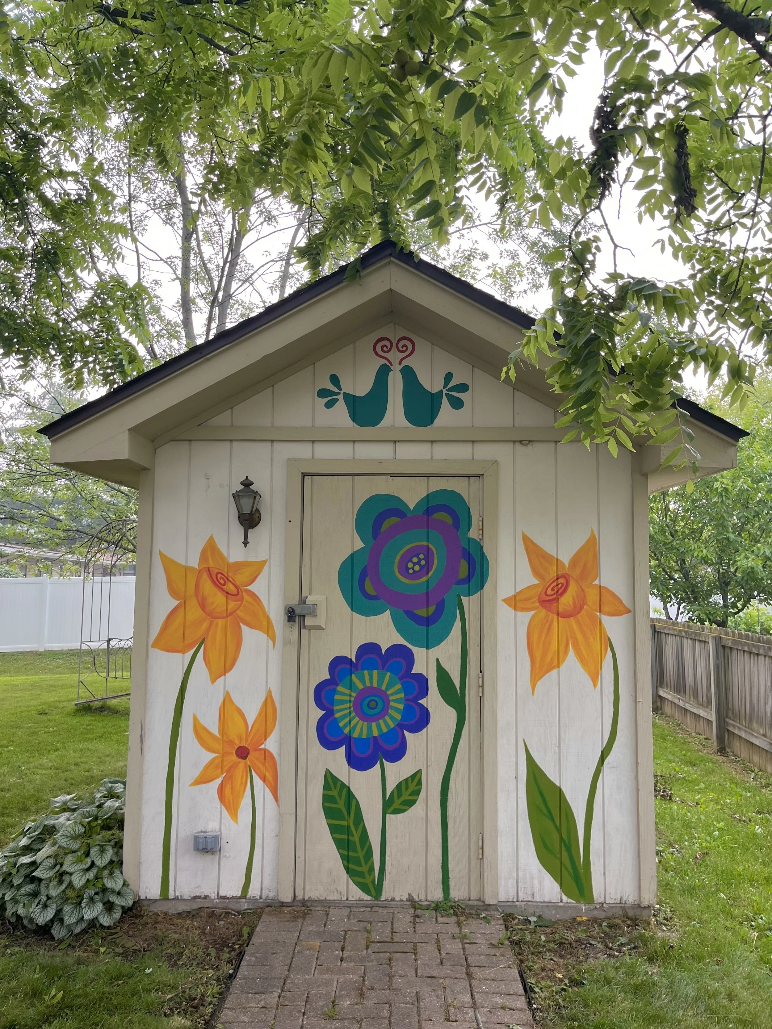 Garage Mural: Clients wanted a mural on their garage that represented a landscape of florals. Clients asked for large graphic florals inspired by shibori dye techniques.