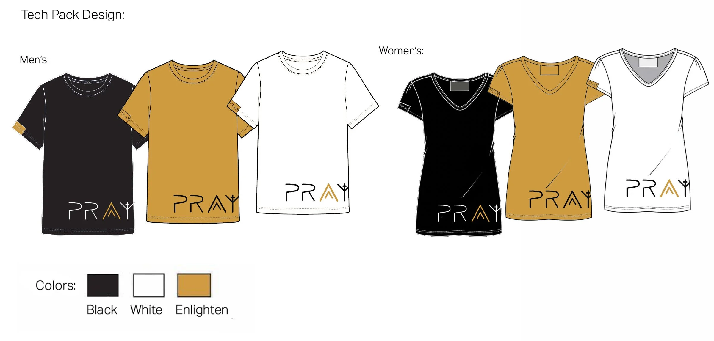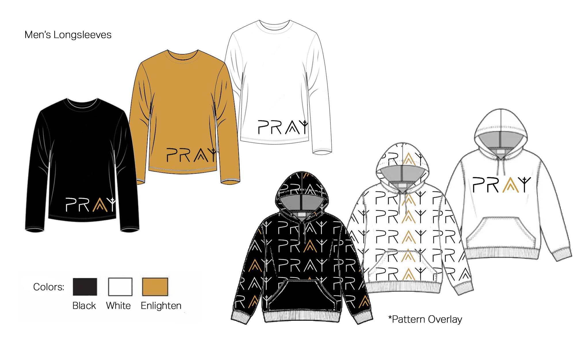 Apparel design for Pray based off of Sanctuary Clothing. Working to create the Pray logo, brand icons, 5 repeat prints with different colorways and color ideation onto different articles of apparel for production.